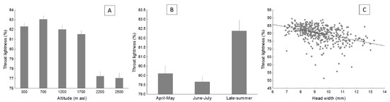 Average values of throat lightness (with SE) in the lizard P. algirus, according to altitude (A) and season (B), and the relationship between throat lightness and head width (C). Notice that raw data are shown, but statistical analyses were performed with transformed data when necessary.