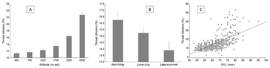 - Food availability increases with elevation in our study population [83]. Chromatic properties of lizard skin correlate with pigment density, highly saturated colour patches having more pigment density than paler and duller ones [84]. Therefore, if throat pigment concentration depends on food (e.g., if they are carotenoid-dependent), the increase in food availability could explain the highest investment in throat colouration with altitude [85,86]. The altitudinal pattern for eyespots would be different as structural colour are presumed to be less affected by food availability.