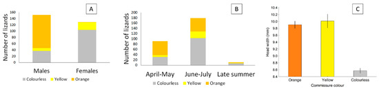 Frequency of P. algirus lizards with colourless, yellow or orange commissure according to sex (A) and season (B), and head width (with SE) of lizards according to commissure colour (C).