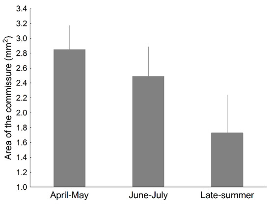 Average values of commissure area (with SE) in the lizard P. algirus, according to season.