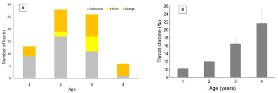 Frequency of lizards with colourless, yellow or orange commissure according to age (A) and average (with SE) throat chroma according to age (B).