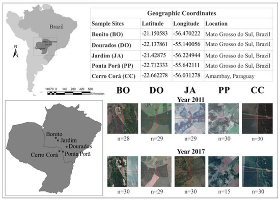 This study encompassed five sampling sites, four of which are located in the state of Mato Grosso do Sul, in the cities of Bonito, Dourados, Jardim, and Ponta Porã, and the fifth site, located in the Department of Amambay in Paraguay, in the Cerro Corá National Park (Figure 1). The sites Bonito, Jardim, and Cerro Corá are located in environmental reserve areas, and consequently are less affected by anthropic activity although surrounded by farms and agricultural areas. The other sites (Dourados and Ponta Porã) are located in the vicinity of agricultural areas, where land degradation is high.