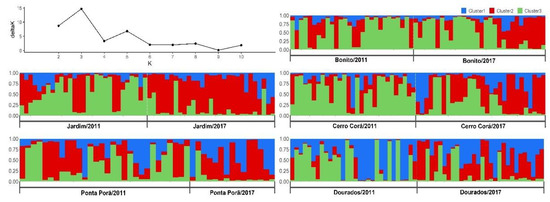 Genetic structure described by AMOVA revealed low structuring between populations, because FST values ranging from 0 to 0.05 indicate low genetic differentiation [49,50]. The population structure analyzed through Bayesian inference using the STRUCTURE software between years and among populations showed that the analysis between years also revealed low genetic structure.