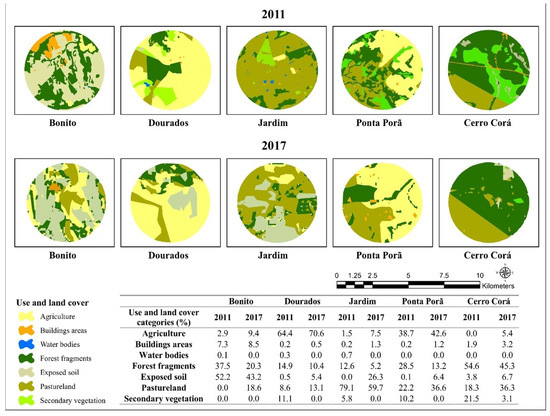 The proportions of land use and land cover conditions are demonstrated in Figure 3. In general, over the years 2011 and 2017, there was an increase in the areas of agriculture, exposed soil, and pastureland and a decrease in forest fragments and secondary vegetation. In both years, Dourados and Ponta Porã had the highest percentages of agricultural area, and these populations together with Jardim had a decrease in the area under secondary vegetation cover.