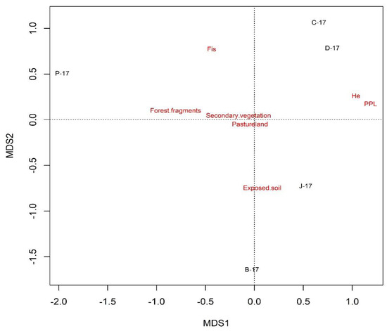 Principal component analysis (PCA) based on the genetic parameters (FIS and HE) and the land cover conditions (forest fragmentation, secondary vegetation, pastureland, and exposed soil) for the five populations (color black) of the year 2017.