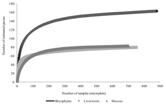Sampling completeness was high for both taxonomic groups, varying from 87.5% (liverworts; Chao 2) to 94.5% (mosses; Chao 2) (Figure 2). The number of unique entries exceeded the number of duplicates for every taxonomic group, but the values were similar between mosses and liverworts. The high values obtained with the three estimators are reflected in the shape of the mean accumulation curves built for the total number of bryophytes, liverworts, and mosses (Figure 2), which appear to be reaching an asymptote.