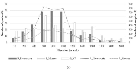 Ecological gradients, such as elevational ones, help to identify the most important explanatory variables, which may be used to predict species distribution patterns on local and regional scales []. The bryophyte richness (alpha diversity) and distribution along elevational gradients have been reported in four main patterns: decrease, increase, mid- elevational peak and double peak. In Uganda, Tusiime et al. [] described a decreasing richness trend with increasing elevation between 1160 m and 2607 m. In Fennoscandia, Bruun et al. [] found that the richness of mosses and liverworts followed an increasing pattern with increasing elevation between 250 m and 1525 m. In the island of La Réunion, Ah-Peng et al. [], found a parabolic unimodal pattern with a mid-elevation peak, when analyzing epiphytic bryophytes from 350 m to 2750 m. In China, Sun et al. [] showed that the ground-dwelling bryophyte richness, studied between 2001 m and 4221 m, presented a double peak of diversity around 2750 m and at the top of the transect.