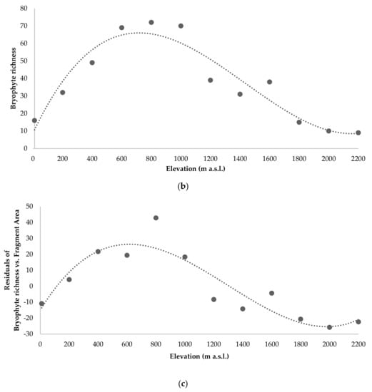 where R2 = 0.899 (Figure 3b). The contribution of the area for this pattern was minimal, since the model considering the relationship between the residuals of the bryophyte richness and the fragment area (A_FR) and elevation showed only a small decrease of R2 (R2 = 0.829), according to the polynomial regression in Equation (7) (Figure 3c):