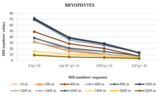 The results from comparing the Hill numbers’ profiles between elevation bands showed somewhat contrasting patterns. The richest sites (600–1000 m a.s.l.) also showed the greater decrease in the effective number of species due to the high dominance of some species (e.g., Radula aquilegia and Hypnum uncinulatum) and a large number of rare species. In contrast, particularly at the highest elevations, these numbers stayed more constant, revealing a high evenness (Figure 4).