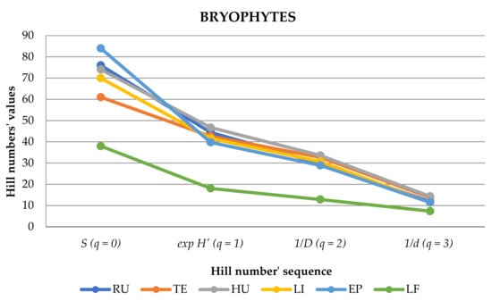 Mosses growing on rocks (RU) showed the highest effective number of species, while liverworts followed the general pattern presented in Figure 5.