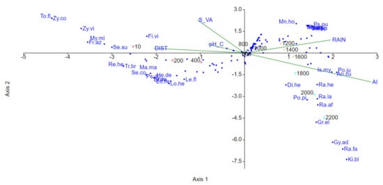 Ordination diagram showing the result of the canonical correspondence analysis (CCA) of the 141 bryophyte species (blue dots) along the first two axes, the 12 sites (open circles) and their correlation with 5 explanatory variables (green segments). The segments show the direction of maximum variation in the ecological variables; longer segments indicate stronger correlations between variables and axes. The directions and lengths of the segments show the degree of correlation between species composition and the explanatory variables. The names of the species with the highest contribution to the model (38 species of the fourth quartile) are indicated by their abbreviations (Appendix A). Explanatory variables included the elevation (ALTI), disturbance index (DIST), bark pH (pH_C); mean annual precipitation (RAIN); and richness of vascular plants (S_VA).
