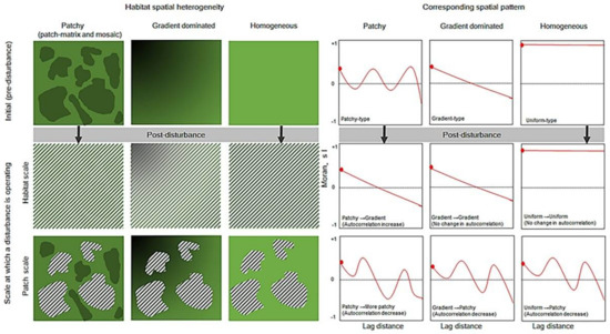 However, the direction and magnitude of disturbance-driven changes in the spatial patterns of biodiversity could depend on multiple factors, including the scale at which particular disturbances operate [17,21,23,24,25,26] and the type and intensity of disturbance. Of course, such effects may further depend on the spatial heterogeneity of the habitat template [26,27]. In a spatially patchy habitat (e.g., patch-matrix or mosaic), which is usually characterized by a patchy-type of spatial pattern, disturbances operating at the scale of a habitat may weaken or homogenize the within-habitat biotic and abiotic heterogeneity [24]. This may lead to a shift from patchy-type to gradient- or to random-type of spatial patterns [23], or may lead to an increase in the overall positive autocorrelation in biodiversity (Figure 1). Here, a patchy-type of spatial pattern can be defined as the pattern where the overall autocorrelation is significant, but the shape of the pattern is somewhat wavy. A gradient-type of spatial pattern can be defined as the pattern where the overall autocorrelation is significant, but the shape of the pattern is somewhat an accelerating or decelerating line; and a random-type of pattern can be attributed to the abundance of fine-scale patches or local spatial structures, resulting in an overall non-significant spatial autocorrelation in biodiversity. However, in the same patch-matrix or mosaic habitat, disturbances, operating at the scale of a microhabitat patch, may increase the within-habitat biotic and abiotic heterogeneity [24,28], causing a decrease in overall positive spatial autocorrelation or generate a more patchy-type of post-disturbance patterns in biodiversity. In a gradient-dominated or homogeneous habitat with a gradient- or a random-type of spatial pattern, disturbances operating at the scale of a habitat may not affect the overall spatial pattern. Whereas, disturbances operating at the scale of a microhabitat patch may create new patches (i.e., shift from a gradient-type or a random-type to a patchy-type pattern) [23] or a decrease in the overall spatial autocorrelation in biodiversity (Figure 1). Yet, these aspects of disturbance and resultant changes in the categories of spatial patterns are rarely considered explicitly in disturbance versus spatial patterns of biodiversity studies.