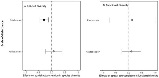 Disturbance effects on spatial autocorrelation in species (A) and functional diversity (B) for patch-scale and habitat-scale disturbances. Shown in the figure is mean (solid point) and 95% confidence intervals (solid line). Statistically significant effects are shown in dark colour, and non-significant effects are shown in grey.