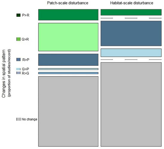 Mosaic plots of the relative frequency of disturbance-driven changes in the categories spatial patterns of biodiversity for different types and scales of disturbance. Bar widths are proportional to the number of studies. The height of each bar segment corresponds the relative frequency of certain type of pattern-change among studies for the disturbance type. P > R indicates a shift from patchy to random pattern, G > R indicates a shift from gradient to random, R > P indicates a shift from random to patchy, G > P indicates a shift from gradient to patchy, R > G indicates a shift from random to gradient pattern.