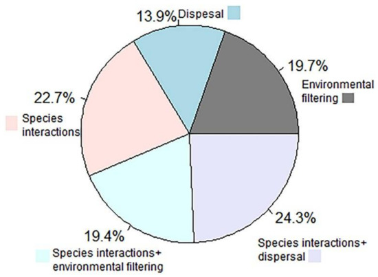 Species interactions (22.7% cases), the combined effects of species interactions and dispersal (24.3%), or the combined effects of species interactions and environmental filtering (19.4%) appeared as the key driver underlying the observed changes in the spatial patterns of biodiversity (Figure 6). The unique roles of environmental filtering and dispersal as a driver of changes in spatial biodiversity pattern were identified in about 19.7%, and 13.9% cases, respectively. Interestingly, the role of dispersal was most frequently highlighted in the case of habitat-scale disturbance, while the role of species interactions was frequently highlighted in the case of patch-scale disturbances.
