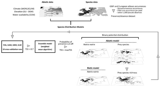 Figure 1. Summary plot of the workflow followed to estimate potential distribution of Natrix natrix by Species Distribution Modeling. The future distribution of the species was projected using future environmental data in the abiotic model, and environmental data and projected prey species richness in the biotic model, assuming unhindered and no dispersal of Natrix natrix and its prey species.