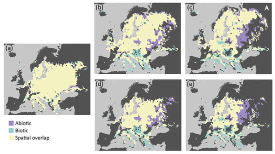 Figure 2. The potential distribution of grass snake as predicted by the abiotic and biotic Species Distribution Model for different time periods: (a) current time period; and by 2060 and 2080 respectively assuming: (b,c) unhindered dispersal; and (d,e) no dispersal of the species. Scale: 1:110,000,000.