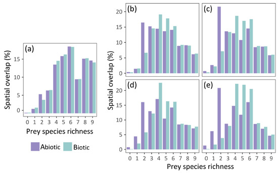 Figure 3. Spatial overlap (%) of N. natrix predicted potential distribution with prey species richness: (a) under current conditions; and by 2060 and 2080 respectively assuming: (b,c) the unhindered dispersal scenario; (d,e) the no dispersal scenario.