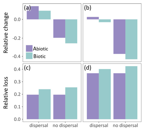Figure 4. Grass snake’s vulnerability to climate warming according to the abiotic and biotic model assuming unhindered and no dispersal of the species. Vulnerability is measured as follows: (a,b) relative change (CSA); and (c,d) relative loss (LSA) of its potential distribution by: (a,c) 2060; and (b,d) 2080.