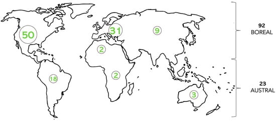 The typologies of studies covered by the papers retrieved with the systematic evidence review were mainly taxonomic (65%) and ecologic (21%); less frequent were studies on flatworms’ distribution (4%), and phylogeny (3%). We did not detect any behavioral study; 7% of the papers did not match any of the typologies considered. 80% of the papers have sampling sites located in the northern hemisphere, while the southern hemisphere appears poorly represented (Figure 1). Moreover, 50 of the 113 observations came from North America (all in the United States), 31 from Europe (21 in Italy), nine from Asia, and two from North Africa. Among southern continents, South America was the most represented (18 observations), followed by Australia and Tahiti with three observations each (Figure 2).