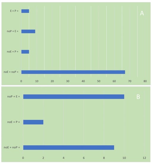Number of planarians species reported in the selected papers for groundwaters (A) and adjacent surface habitats (B) with both eyes and pigmentation (E + P), eyes but depigmented (E + noP), pigmentation but eyeless (noE + P) and showing complete troglomorphism being both depigmented and eyeless (noE + noP).