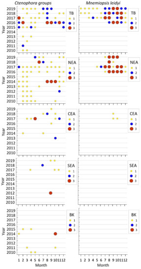 - Shiganova, T.; Sommer, U.; Javidpour, J.; Molinero, J.C.; Malej, A.; Kazmin, A.S.; Isinibilir, M.; Christou, E.; Sioku-Frangou, I.; Marambio, M.; et al. Patterns of invasive ctenophore Mnemiopsis leidyi distribution and variability in different recipient environments of the Eurasian seas: A review. Mar. Environ. Res. 2019, 152, 1–23. [Google Scholar] [CrossRef] [PubMed]