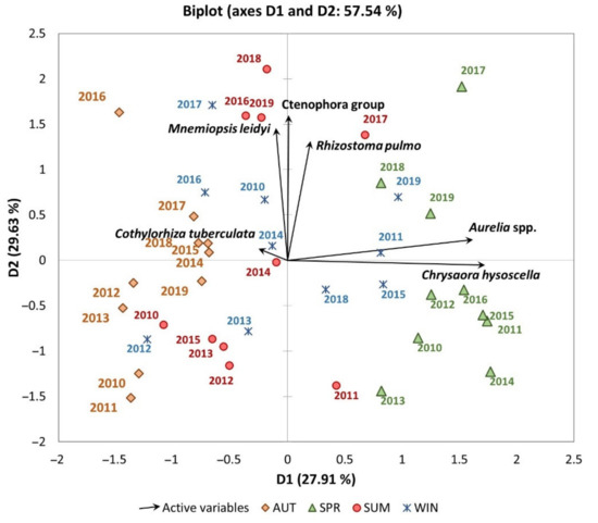 - Leoni, V.; Bonnet, D.; Ramirez-Romero, E.; Molinero, J.C. Biogeography and phenology of the jellyfish Rhizostoma pulmo (Cnidaria: Scyphozoa) in southern European seas. Glob. Ecol. Biogeogr. 2021. [Google Scholar] [CrossRef]