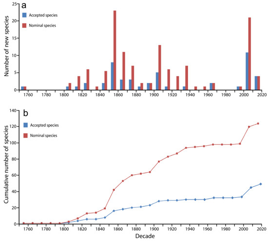 Description of new Hippocampus species, accepted and nominal (1758–2020): numbers per decade (a) and cumulative (b). Original data from FishBase and WoRMS [66,67]. Accepted species are listed in Table 1.