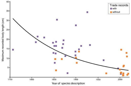 Maximum length of newly described Hippocampus species (1758–2020, n = 48), with and without trade records [69], based on data in Table 1, showing a tendency for additional new species to become exponentially smaller in size, approaching the function y = 60.17 × 106 × e−0.01x (Pearson correlation coefficient, ln-transformed (R = −0.675, p < 0.00001).