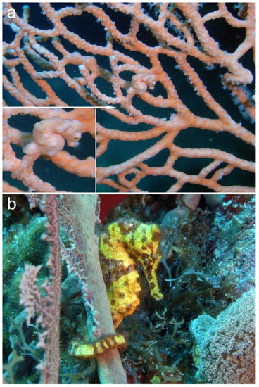 Two Hippocampus individuals clinging to gorgonian octocorals in their natural environment: (a) H. denise at Raja Ampat Islands, West Papua, Indonesia (2006); (b) H. reidi at St. Eustatius, Eastern Caribbean (2015). Photo credit: B.W. Hoeksema.