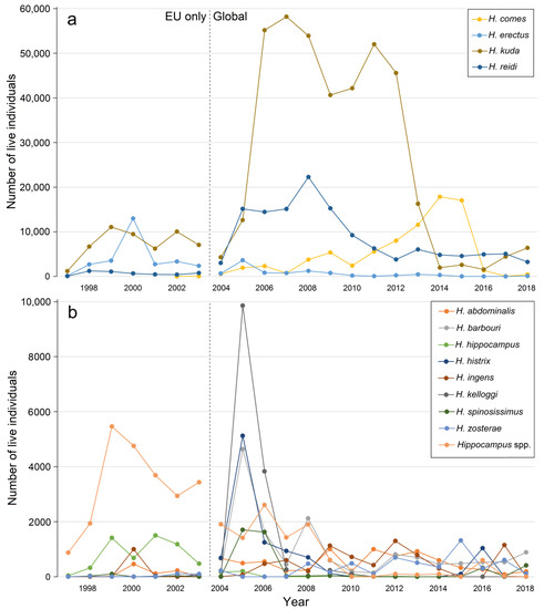 Annual trade records of live seahorses based on import data of the 12 internationally most traded species in the periods 1997–2003 (pre-CITES records from the EU) and 2004–2018 (global) [69]: (a) high annual numbers; (b) lower numbers.