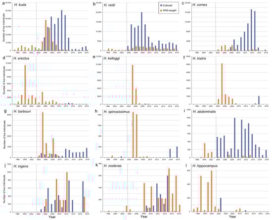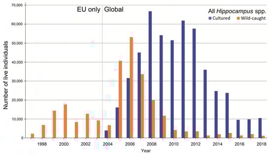 In our analyses, all importing and exporting countries and all trade purposes were included. Only “live” specimens were considered in the trade terms. Sources only included codes “W” (taken from the wild), “U” (unknown), “C” (captive-bred), and “F” (born in captivity as F1 generation from wild-caught parents F0). When a source is “U” or not mentioned, the trade database assumes that it concerns “W”. This is most evident in pre-CITES data, when there was no recorded trade in cultured specimens (Table 2). Seahorses that were reared in captivity are considered cultured (coded as “C” and “F”). Numbers of seahorses that were ranched were negligible and therefore not taken into account. Re-exports, although uncommon, were excluded from the analyses to prevent duplicates. For example, 200 specimens of H. zosterae (W) were exported from the United States to the Netherlands in 2017 and re-exported to Mexico in 2018 [69]. Individuals of the same species were exported to Canada in 2010, Germany in 2012, South Africa in 2015, and returned to the United States in the same years [69]. The CITES trade database does not include data on domestic trade, mortality of seahorses in captivity, or cultivation in import countries.