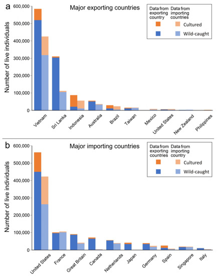 Regarding the trade of seahorses in the aquarium industry and those used as traditional medicine, there are differences in scale, species composition, source countries, and consumer countries, which can be found in primary sources, such as the CITES Trade Database [69] and also in published reports [133].