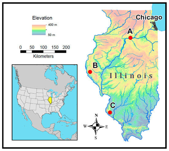Three caves, representing areas in the north, central, and south of Illinois, were selected for this study (Figure 1). Upland forest, floodplain forest, and savanna communities, as well as dolomite prairies and dolomite cliffs, surround the cave in the north region of Illinois. This site is an abandoned limestone mine with several entrances, with several pools of water typically present (A); while in central Illinois (B), pine plantation and successional fields, as well as dry-mesic upland forest and floodplain forest surrounds the cave. This site has seven entrances, composed of limestone bedrock with a main stream. The south region cave (C) comprises several miles of underground streams, containing nearly pristine subterranean wilderness. This site is composed of limestone bedrock and is considered a solution cave. It harbors multiple bat species, including federal and state endangered species and invertebrate cave fauna. Many threatened and endangered species live in or around the cave systems. Birds, mammals, and herptiles live in these areas, in addition to crustaceans and insects that are endemic to these sites [25]. The caves are part of nature preserve areas, are closed to the public, and the names have been withheld to protect these unique and fragile ecosystems.