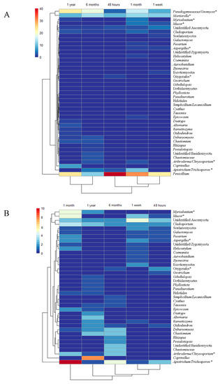 Pheatmap displaying fungal isolation patterns over storage time frame. (A) All Fungal taxa isolated; (B) Taxa isolated in low frequency. Panel (A) indicated 0–1 month were more similar to each other than 6 month–1 year based on storage time; Panel (B) demonstrates that low-frequency isolates were isolated more frequently at different time frames throughout the experiment. Potential fungal taxa indicated with an *.
