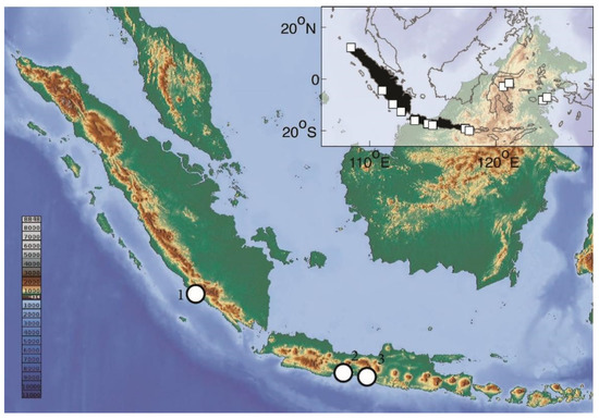 - Aoyama, J.; Wouthuyzen, S.; Miller, M.J.; Minegishi, Y.; Kuroki, M.; Suharti, S.R.; Kawakami, T.; Sumardiharga, K.O.; Tsukamoto, K. Distribution of leptocephali of the freshwater eels, genus Anguilla, in the waters off west Sumatra in the Indian Ocean. Environ. Boil. Fishes 2007, 80, 445–452. [Google Scholar] [CrossRef]