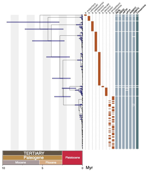 - Kapli, P.; Lutteropp, S.; Zhang, J.; Kobert, K.; Pavlidis, P.; Stamatakis, A.; Flouri, T. Multi-rate Poisson Tree Processes for single-locus species delimitation under Maximum Likelihood and Markov Chain Monte Carlo. Bioinformatics 2017, 33, 1630–1638. [Google Scholar] [CrossRef]