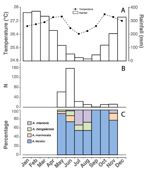 - Arai, T.; Kadir, S.R.A. Opportunistic spawning of tropical anguillid eels Anguilla bicolor bicolor and A. bengalensis bengalensis. Sci. Rep. 2017, 7, 1–17. [Google Scholar] [CrossRef] [PubMed]