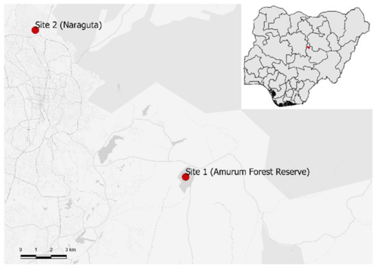 Locations of the study sites within Nigeria (top right insert): Site 1 = Amurum Forest Reserve, Site 2 = Naraguta.
