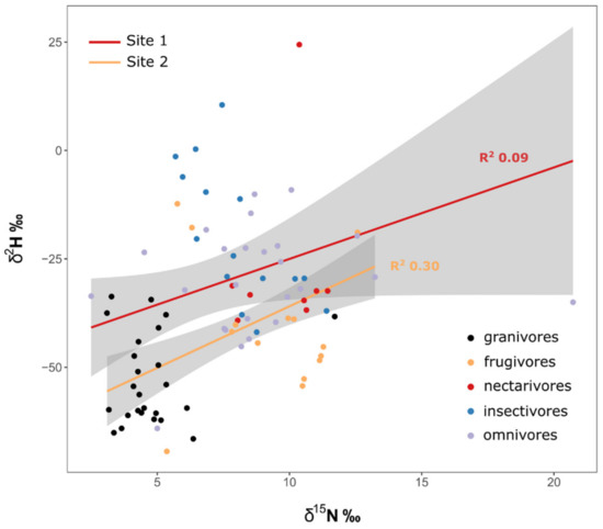 Regression between δ2H vs. δ15N by site, with colors representing different guilds. Regression lines are indicated in shaded grey, with the 95% confidence band of the regression estimate and its corresponding R2 values.