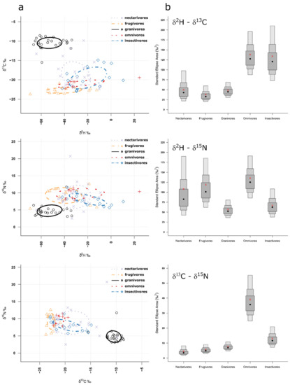 (a) Independent calculated ellipses containing 40% of the isotopic data for the five different guilds for all combinations of isotopes. (b) Posterior distributions of isotopic niche size (Bayesian Standard Ellipse Areas) for the five different feeding guilds for all combinations of isotopes. Grey boxes represent 40% (dark shading), 75% (medium shading) and 95% (light shading) credible intervals, with red crosses designating the model values and black dots the median.