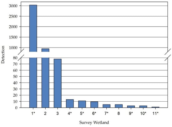 Autonomous recording unit (ARU) detections for wood frog at 12 wetland sites in Calgary, AB, Canada whereby * indicates sites where wood frogs were not reported by citizen scientists (only 11 sites are displayed because wetland 6 was a repeat monitoring site and citizen scientists missed recording wood frog both years, displayed here as average number of detections). Of those sites where wood frogs were not reported by citizen scientists, only wetland 1 had greater than 15 recorded calls during the duration of the season. Four wetland sites with no recorded wood frog detections are not displayed on the graph.