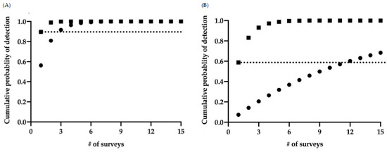 Cumulative probability of detection of citizen scientists surveys (circles) compared to ARUs (squares) for boreal chorus frogs Pseudacris maculata (A) and wood frogs Lithobates sylvaticus (B). Where the dashed line intersects the circles indicates the number of surveys that would need to be completed by citizen scientists to equal the single survey probability of detection for ARUs.