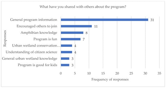 Survey responses indicated the program attracted individuals who were already interested in environmental issues (65%) and gave them a means to act on their interest or concern (Figure 5). In addition, 95% of respondents confirmed they had spoken to others (friends, family, neighbours, colleagues) generally about the program and recruited others to contribute. However, it was less common for a participant to share specific knowledge on urban wetlands, amphibian conservation, and/or municipal planning issues (Figure 6).