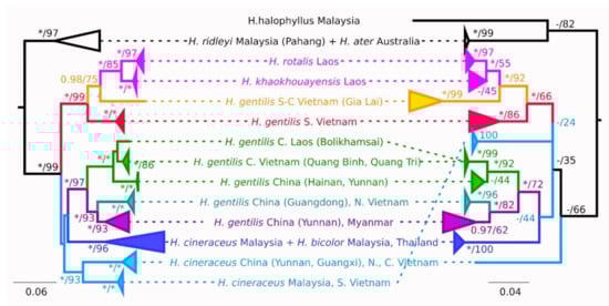 Specimens from the mountain and lowland regions of southern Vietnam arranged themselves into distinct, but related, haplogroups (also related to the H. khaokhouayensis/rotalis lineage) in the mtDNA analysis. However, the nuDNA data is more likely to group animals from different parts of the Vietnamese mountain areas (Dalat plateau, Gialai–Kontum plateaus, and the northern part of central Vietnam) and from northern Vietnam together, suggesting a common origin of these populations. At the same time, the southern lowland branch has full support and is a sister clade to all other H. gentilis specimens. Given such topology discordance, we may suppose that the H. gentilis populations of southern Vietnam once obtained mtDNA from the common ancestor of the H. khaokhouayensis/rotalis lineage (with which they have no direct contact in present). It is difficult to pinpoint the exact time frame of these introgressive events, but they might have happened approximately on the late Pliocene and early Pleistocene boundary (based on the estimated divergence time between H. gentilis and H. khaokhouayensis: [1]). Noteworthily, the H. gentilis population co-occurring with H. khaokhouayensis in sympatry on Catba island does not show any traces of such introgression. One may suggest other scenarios leading to the discordance between mitochondrial and nuclear data, for example, ancestral polymorphism, but they seem less likely to us than introgression. The verification of one hypothesis or another requires more material than we currently have, and, probably the employment of additional markers (e.g., microsatellites).