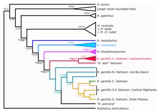 Hipposideros is the core genus to Hipposideridae (Old World leaf-nosed bats), a bat taxon prominent in Southeast Asia. It is also one of the largest mammalian genera, retaining a highly complicated taxonomy even after having lost two of its former species groups, namely “commersoni” and “cyclops” [1,2]. Within the genus, Hipposideros bicolor is a group that comprises the most forms. Many of them are similar in morphology, and their taxonomic placement is often uncertain. In the last decade, significant efforts were dedicated to solving this puzzle (e.g., [3,4,5]).