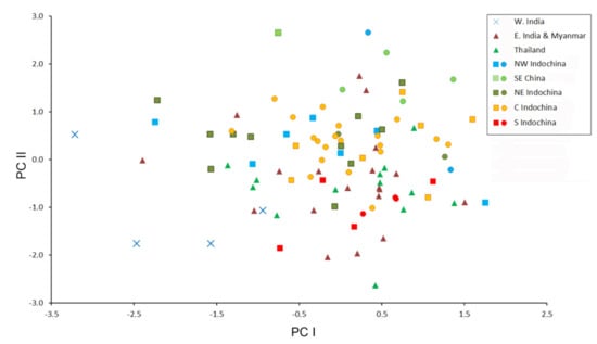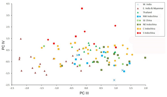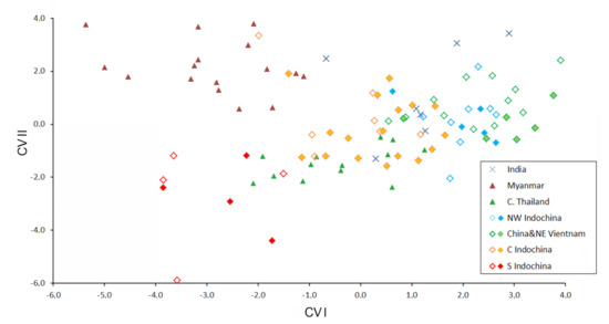 To assess the variation pattern of quantitative characters, Principal Component (PC) and Discriminant Function (DF) analyses were performed for the 20 craniodental measurements, using STATISTICA for Windows version 9.0 (StatSoft, currently TIBCO Software Inc., Palo Alto, CA, USA). DF analysis was used to calculate squared Mahalanobis distances between groups and the significance of inter-group differences. The training set for calculating the squared Mahalanobis distances for the DF analysis included six samples, namely “Myanmar”, “Central Thailand”, “NW Indochina”, “NE Indochina and SE China”, “C Indochina” and “S Indochina”. The third and fourth training sets were selected based roughly on the two haplogroup (SY and SM) ranges as they are described in [5]. Indian material, due to low specimens’ availability, was not treated as a training set, but was included in the analysis as “unidentified”.