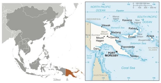 Regional map and major landmarks of PNG. From CIA World Factbook [https://www.cia.gov/library/publications/the-world-factbook/geos/pp.html (accessed on 3 June 2021)].