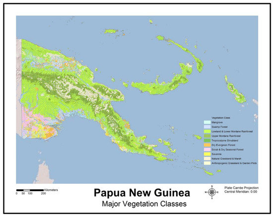 The island of New Guinea (comprised of West Papua and Papua New Guinea) is the largest tropical island in the world, with a total land area of approximately 785,750 km2. Due mainly to its great elevation range (sea-level to 4500 m ASL), combined with a tropical climate and diverse topography and geologic origins, Papua New Guinea (hereafter, PNG) harbors diverse and unique life zones and forested habitats not found elsewhere in the Pacific Islands [1,2,3,4] (Figure 1 and Figure 2). After the Amazon and Congo basins, the forests of PNG comprise the third largest expanse of tropical forest in the world and are internationally recognized for their high biodiversity and ecological importance, both locally and globally [5,6,7]. Indeed, some areas of PNG (i.e., the islands of the Bismarck Archipelago) are currently classified as part of a global “biodiversity hotspot” ([8,9]. Host to one of the richest assemblages of vertebrates on Earth, the forests of PNG harbor at least 1786 species of birds, mammals, reptiles, and amphibians [7]—over 5 percent of the world’s total—with many yet undiscovered and undescribed. Covering nearly 282,000 km2 and 80 percent of the land mass of PNG [7], these forests have in recent decades come under increasing pressure from logging activities, agroforestry-related land clearing, mining activities, oil and gas development, and increasing subsistence agriculture arising from a rapidly increasing human population [4,5,6,7,8,9,10,11].
