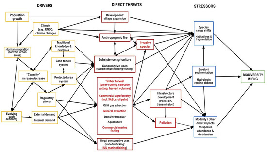 Situation Model based on quantitative assessment of biodiversity threats and associated drivers in Papua New Guinea. Bidirectional vectors represent interactions between component factors.